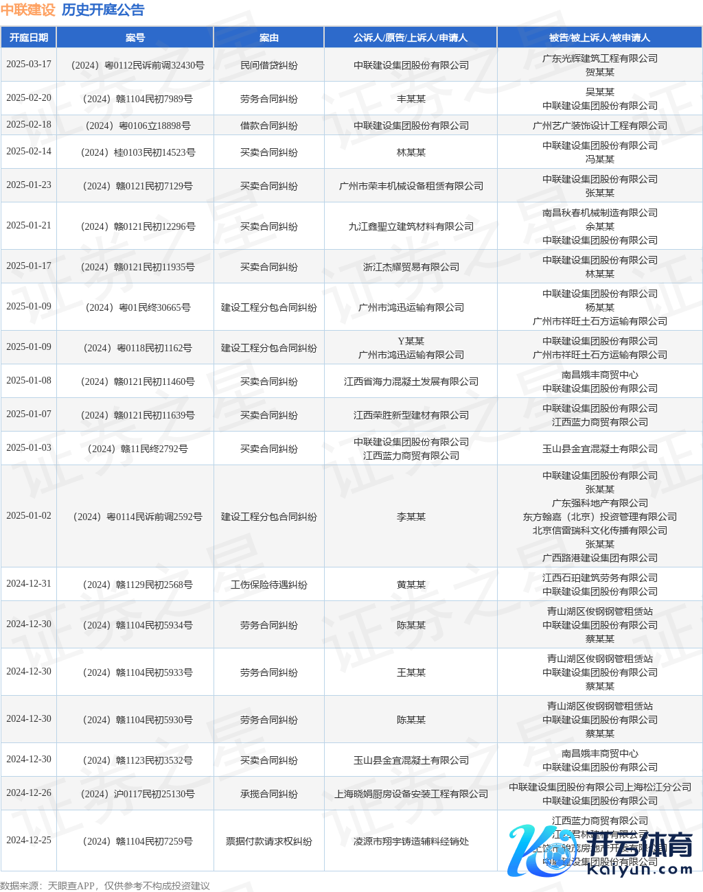 案号:(2024)赣0121民初11639号审理法院:南昌县东说念主民法院案由:营业公约纠纷当事东说念主信息: 原告/上诉东说念主:江西荣胜新式建材有限公司 被告/被上诉东说念主:中联确立集团股份有限公司、江西蓝力商贸有限公司开庭日历:2025年1月7日凭据统计,近一年内以中联确立集团股份有限公司为当事东说念主的历史开庭公告有197则,其中案由为“营业公约纠纷”的公告以69则居首,其次为“确立工程施工公约纠纷”有35则,“建筑开辟租出公约纠纷”有18则。历史开庭公告(前20条)如下: